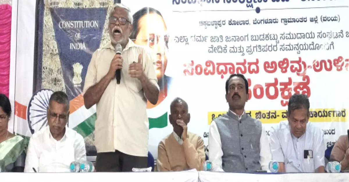 ಗುಡಿಬಂಡೆ : ನಮ್ಮ ದೇಶದ ಪ್ರಜೆಗಳ ನಾಗರಿಕ ಹಕ್ಕುಗಳನ್ನು ಪ್ರಶ್ನಿಸುವಂತಹ ಹಕ್ಕು ಚುನಾವಣಾ ಆಯೋಗಕ್ಕೆ ಇಲ್ಲ ಎಂದು ಚಿಂತಕ ಶಿವಸುಂದರ್ ಅಭಿಪ್ರಾಯ ವ್ಯಕ್ತಪಡಿಸಿದ್ದಾರೆ. ತಾಲೂಕಿನ ಬೀಚಗಾನಹಳ್ಳಿ ಗ್ರಾಮದಲ್ಲಿನ ಸಮುದಾಯ ಭವನದಲ್ಲಿ ಸಂವಿಧಾನ ಸಂರಕ್ಷಣಾ ಪಡೆ- ಕರ್ನಾಟಕದ ವತಿಯಿಂದ ಆಯೋಜಿಸಿದ್ದ ‘ಸಂವಿಧಾನ ಅಳಿವು ಉಳಿವು ಸಂರಕ್ಷಣೆ’ಯ ಒಂದು ದಿನದ ಕಾರ್ಯಾಗಾರ ಚಿಂತನ ಮಂಥನ ಕಾರ್ಯಾಗಾರದಲ್ಲಿ ಮಾತನಾಡಿದ ಅವರು, ಹಿಂದಿನ ಕಾಲದಲ್ಲಿ ರಾಜ ರಾಣಿಯ ಹೊಟ್ಟೆಯಲ್ಲಿ ಹುಟ್ಟುತ್ತಿದ್ದರು. ಈಗ ರಾಜ ಮತದಾರರ ಪಟ್ಟಿಯಲ್ಲಿ ಹುಟ್ಟುತ್ತಿದ್ದಾನೆ. ಇದು ಈ ದೇಶಕ್ಕೆ ಸಂವಿಧಾನ ಜಾರಿಯಾದಾಗಿನಿಂದ ಮಾತ್ರ. ಈ ದೇಶದ ಸಂವಿಧಾನ ಪ್ರತಿಯೊಬ್ಬ ನಾಗರಿಕನು ಸಹ ಘನತೆಯಿಂದ ಬದುಕುವಂತಹ ಹಕ್ಕನ್ನು ನೀಡಿದೆ. 18 ವರ್ಷ ತುಂಬಿದ ಈ ದೇಶದ ಪ್ರತಿಯೊಬ್ಬ ನಾಗರಿಕನಿಗೂ ಮತದಾನದ ಹಕ್ಕನ್ನು ನೀಡುವುದು ಚುನಾವಣಾ ಆಯೋಗದ ಕರ್ತವ್ಯವೂ ಆಗಿದೆ. ದೇಶದ ಪ್ರತಿಯೊಬ್ಬ ನಾಗರಿಕನಿಗೂ ಸಹ ಮತದಾನದ ಹಕ್ಕನ್ನು ಪ್ರತಿಪಾದಿಸಿದ್ದು ಡಾ .ಬಿ. ಅಂಬೇಡ್ಕರ್ ಎಂಬುದನ್ನು ಮನವರಿಕೆ ಮಾಡಿಕೊಳ್ಳಬೇಕು ಎಂದು ಹೇಳಿದರು. ಮತದಾರರ ಪಟ್ಟಿ ಪರಿಷ್ಕರಣೆಗೆ ಮನೆಗಳಿಗೆ ಬಿಎಲ್ಒ ರವರು ಬಂದು ಅರ್ಜಿಯನ್ನು ನೀಡುತ್ತಾರೆ. ಆ ಅರ್ಜಿಯನ್ನು ಭರ್ತಿ ಮಾಡಿ ಚುನಾವಣಾ ಕಚೇರಿಗೆ ತಲುಪಿಸಬೇಕು. ಇಲ್ಲವಾದರೆ ನಮ್ಮ ಹೆಸರು ಮತದಾರರ ಪಟ್ಟಿಯಲ್ಲಿ ಇರಲ್ಲ. ಮೊದಲು ಬಿಎಲ್ಒ ಅವರು ಮನೆಗಳಗೆ ಭೇಟಿ ನೀಡಿ ಹೆಸರನ್ನು ಸೇರ್ಪಡೆ ಮಾಡಿಕೊಳ್ಳುವುದು ಅಥವಾ ತೆಗೆಯುವುದನ್ನು ಮಾಡುತ್ತಿದ್ದರು. ಈಗ ಈ ರೀತಿಯಲ್ಲಿ ಮತದಾರ ಪಟ್ಟಿಯನ್ನು ಪರಿಷ್ಕರಣೆ ಮಾಡಲು ಹೊರಟಿದ್ದಾರೆ. ಇದು ತುಂಬಾ ಅಪಾಯದ ನಡೆ. ಜನರು ಎಚ್ಚರಿಕೆಯಿಂದ ಇರಬೇಕಾಗಿದೆ ಎಂದು ತಿಳಿಸಿದರು. ಈ ಸಂದರ್ಭ ಡಿಎಸ್ಎಸ್ ಹಿರಿಯ ಮುಖಂಡ ಎನ್.ವೆಂಕಟೇಶ್, ಜೀವಿಕಾ ಸಂಘಟನೆಯ ರಾಜ್ಯ ಸಂಚಾಲಕ ಕಿರಣ್ ಕಮಾಲ್ ಪ್ರಸಾದ್, ಎಲ್.ಲಕ್ಷ್ಮೀನಾರಾಯಣರೆಡ್ಡಿ, ಮುಹಮ್ಮದ್ ನೂರ್ವುಲ್ಲಾ, ಕೆಡಿಪಿ ಸದಸ್ಯ ಎಚ್.ಪಿ.ಲಕ್ಷ್ಮೀನಾರಾಯಣ, ಮಂಜುನಾಥ್ ರೆಡ್ಡಿ, ಸೌಭಾಗ್ಯಮ್ಮ, ಸೈದ್ ಬಾಷ್, ರಿಝ್ವ್ವಾನ್, ಎದ್ದೇಳು ಕರ್ನಾಟಕದ ಸಮೀರ್, ಶ್ರೀರಂಗಾಚಾರಿ, ಜೀವಿಕಾ ನಾರಾಯಣಸ್ವಾಮಿ, ಚನ್ನರಾಯಪ್ಪ, ಇನ್ನಿತರರು ಉಪಸ್ಥಿತರಿದ್ದರು. ಚುನಾವಣಾ ಆಯೋಗವು ಕಾಲಕಾಲಕ್ಕೆ ಮತದಾರರ ಪಟ್ಟಿಯನ್ನು ಪರಿಷ್ಕರಣೆ ಮಾಡುವುದು ಸಾಮಾನ್ಯ. ಆದರೆ ಜನರಿಗೆ ಅರ್ಥವಾಗದ ರೀತಿಯಲ್ಲಿ ಪರಿಷ್ಕರಣೆ ಮಾಡುವುದನ್ನು ದೇಶದ ಜನ ಮನವರಿಕೆ ಮಾಡಿಕೊಳ್ಳಬೇಕು. ದೇಶದ ನಿವಾಸಿಗಳ ಮೇಲೆ ಕೇಂದ್ರ ಸರಕಾರ ಅನುಮಾನದಿಂದ ನೋಡುತ್ತಿದೆ. -ಶಿವಸುಂದರ್, ಚಿಂತಕ