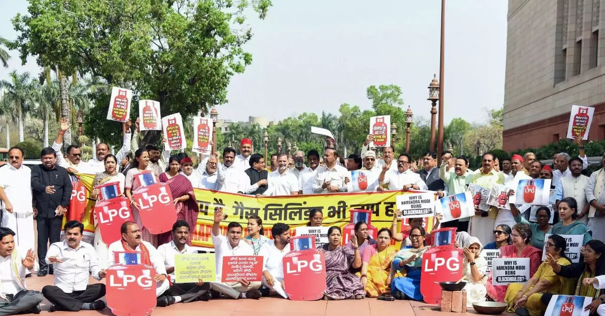 ಅಡುಗೆ ಅನಿಲ ಕೊರತೆ | ಕೇಂದ್ರದ ವಿರುದ್ಧ ಸಂಸತ್ಭವನದ ಸಂಕೀರ್ಣದಲ್ಲಿ ಪ್ರತಿಪಕ್ಷ ಧರಣಿ