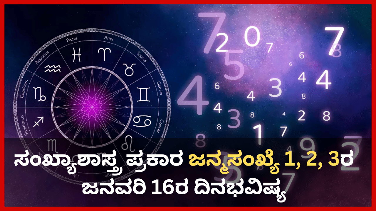 ಜನ್ಮಸಂಖ್ಯೆಗೆ 1, 2, 3ರ ದಿನಭವಿಷ್ಯವನ್ನು ನೀಡಲಾಗಿದೆ. ಜನ್ಮಸಂಖ್ಯೆ ಆಧಾರದಲ್ಲಿ ಜನವರಿ 16ರ ಶುಕ್ರವಾರದ ದಿನ ಭವಿಷ್ಯ ಹೇಗಿದೆ ಎಂಬ ಸವಿಸ್ತಾರ ಮಾಹಿತಿ ಇಲ್ಲಿದೆ. ನಿಮ್ಮ ಕೆಲಸಗಳು, ಹಣಕಾಸಿನ ಹರಿವು, ಸಂಬಂಧಗಳು ಮತ್ತು ಸವಾಲುಗಳನ್