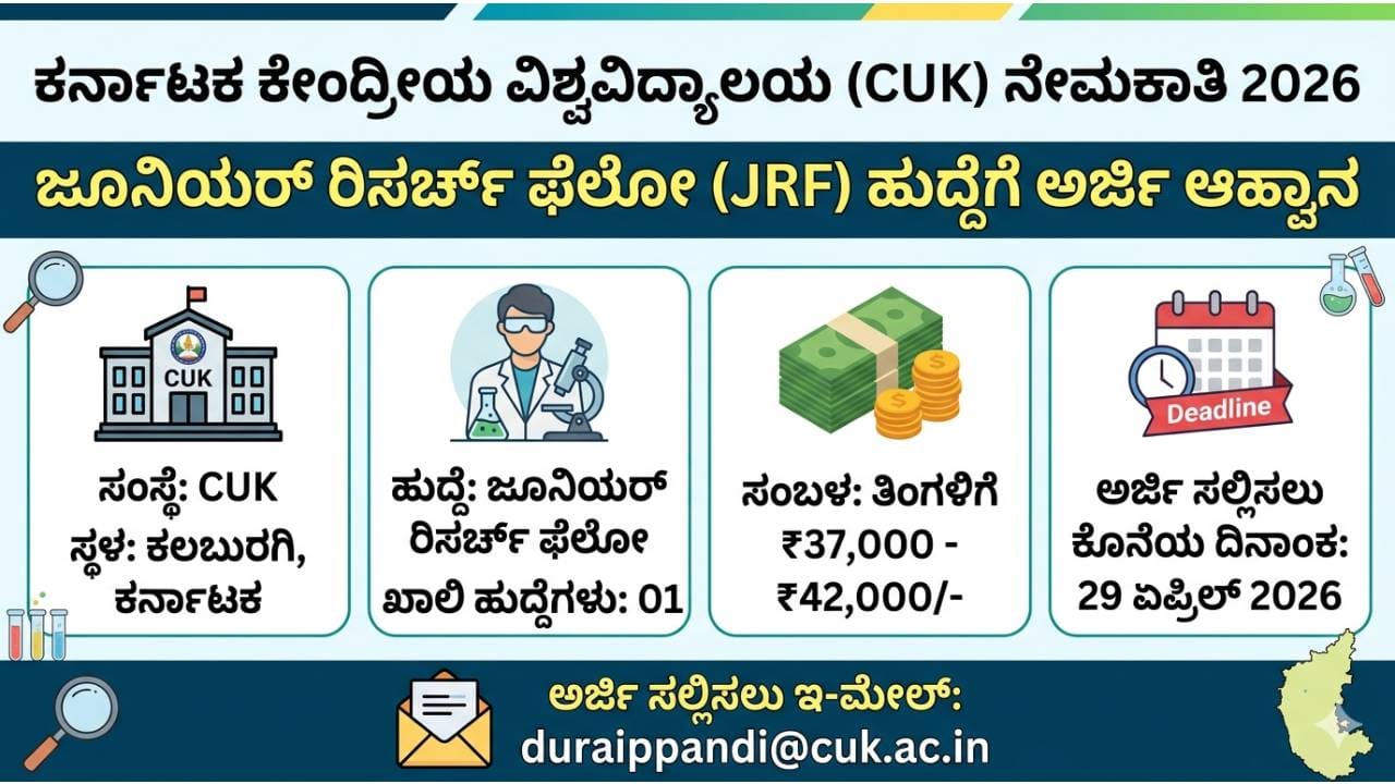 ಕರ್ನಾಟಕ ಕೇಂದ್ರೀಯ ವಿಶ್ವವಿದ್ಯಾಲಯವು (CUK) ಜೂನಿಯರ್ ರಿಸರ್ಚ್ ಫೆಲೋ (JRF) ಹುದ್ದೆಗೆ ಅರ್ಜಿ ಆಹ್ವಾನಿಸಿದೆ. ಕಲಬುರಗಿಯಲ್ಲಿ ಸಂಶೋಧನಾ ವೃತ್ತಿ ಬಯಸುವವರಿಗೆ ಇದೊಂದು ಅವಕಾಶ. ಮಾಸಿಕ ರೂ 37,000 ರಿಂದ 42,000 ವೇತನ ಲಭ್ಯ. ಆಸಕ್ತರು ತಮ್ಮ ಶ