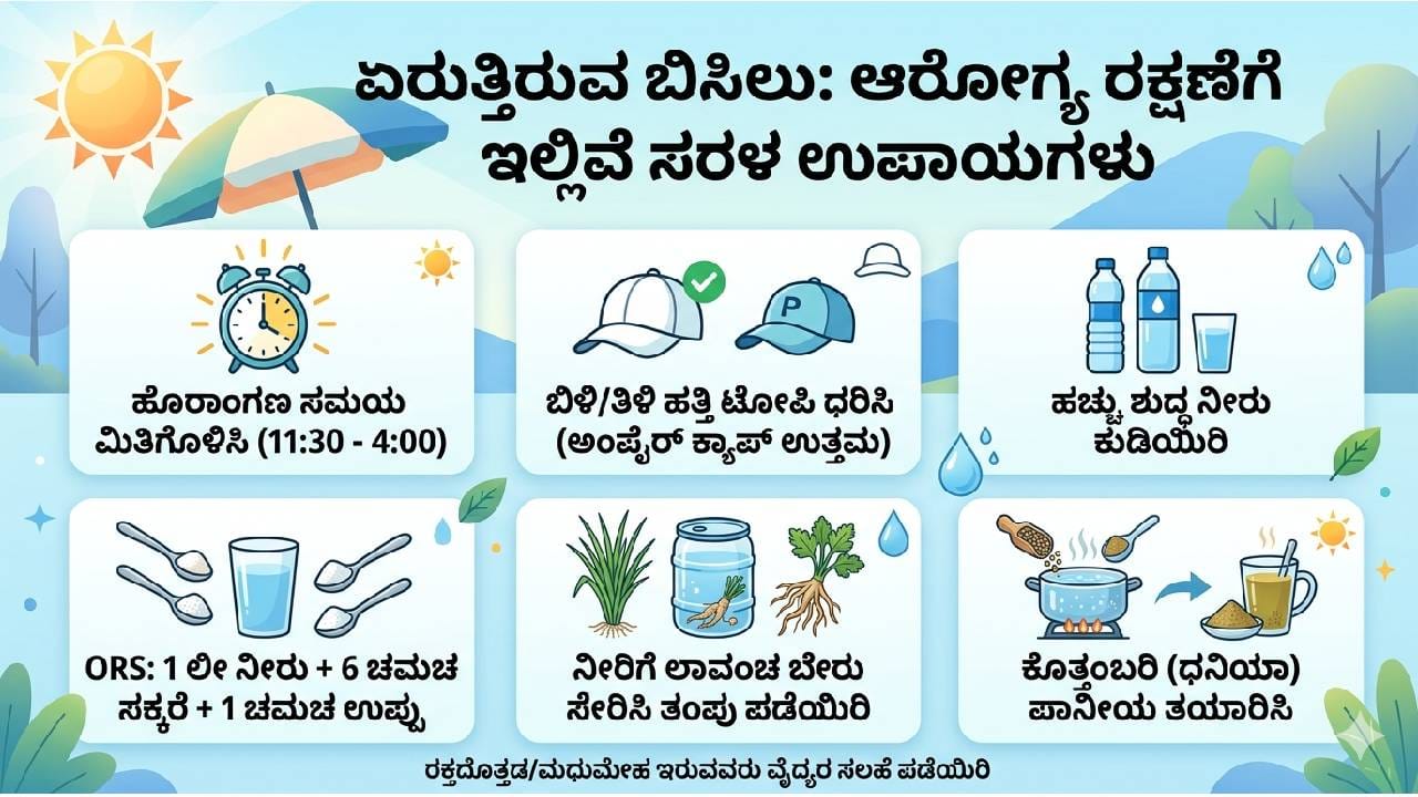 ದಿನೇ ದಿನೇ ಏರುತ್ತಿರುವ ಬಿಸಿಲಿನ ಧಗೆಯಿಂದ ನಿಮ್ಮ ಮತ್ತು ನಿಮ್ಮ ಕುಟುಂಬದವರನ್ನು ರಕ್ಷಿಸಿಕೊಳ್ಳುವುದು ಅತ್ಯಗತ್ಯ. ಮಧ್ಯಾಹ್ನದ ಬಿಸಿಲಿನಲ್ಲಿ ಹೊರಗೆ ಹೋಗುವುದನ್ನು ತಪ್ಪಿಸಿ, ಸೂಕ್ತ ಟೋಪಿಗಳನ್ನು ಬಳಸಿ. ದೇಹದ ಜಲಾಂಶ ಕಾ