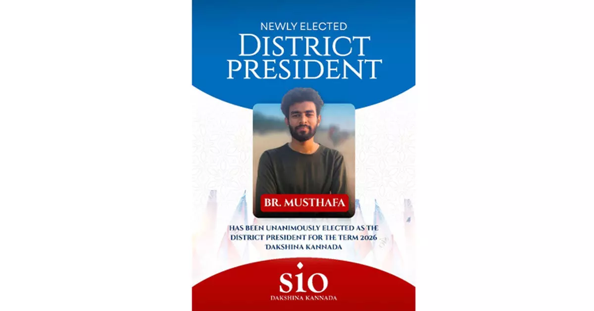 ಮಂಗಳೂರು: ಸ್ಟೂಡೆಂಟ್ಸ್ ಇಸ್ಲಾಮಿಕ್ ಆರ್ಗನೈಸೇಷನ್ ಆಫ್ ಇಂಡಿಯಾ, ದಕ್ಷಿಣ ಕನ್ನಡ ಘಟಕ ಇದರ 2026ನೇ ಅವಧಿಗೆ ಮುಸ್ತಫಾ ಬೆಂಗ್ರೆ ಅವರು ಜಿಲ್ಲಾಧ್ಯಕ್ಷರಾಗಿ ಅವಿರೋಧವಾಗಿ ಆಯ್ಕೆಯಾಗಿದ್ದಾರೆ. ಎಸ್ಐಒ ಕರ್ನಾಟಕ ರಾಜ್ಯ ಕಾರ್ಯದರ್