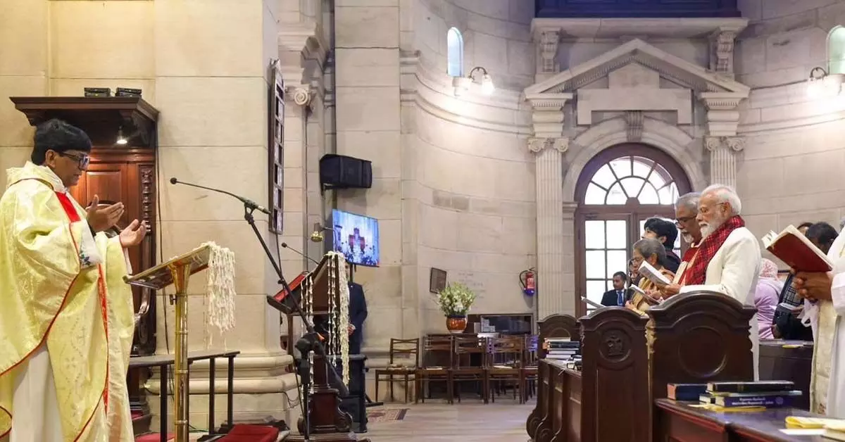 ಹೊಸದಿಲ್ಲಿ: ಇಲ್ಲಿನ ಕ್ಯಾಥೆಡ್ರಲ್ ಚರ್ಚ್ ಆಫ್ ದಿ ರಿಡೆಂಪ್ಷನ್ ನಲ್ಲಿ ಗುರುವಾರ ಬೆಳಿಗ್ಗೆ ನಡೆದ ಕ್ರಿಸ್ಮಸ್ ಪ್ರಾರ್ಥನೆಯಲ್ಲಿ ಪ್ರಧಾನಿ ನರೇಂದ್ರ ಮೋದಿ ಭಾಗವಹಿಸಿದರು. ಪ್ರಾರ್ಥನಾ ಸಭೆಯಲ್ಲಿ ಕರೋಲ್ಗಳು, ಸ್ತುತಿಗೀತ