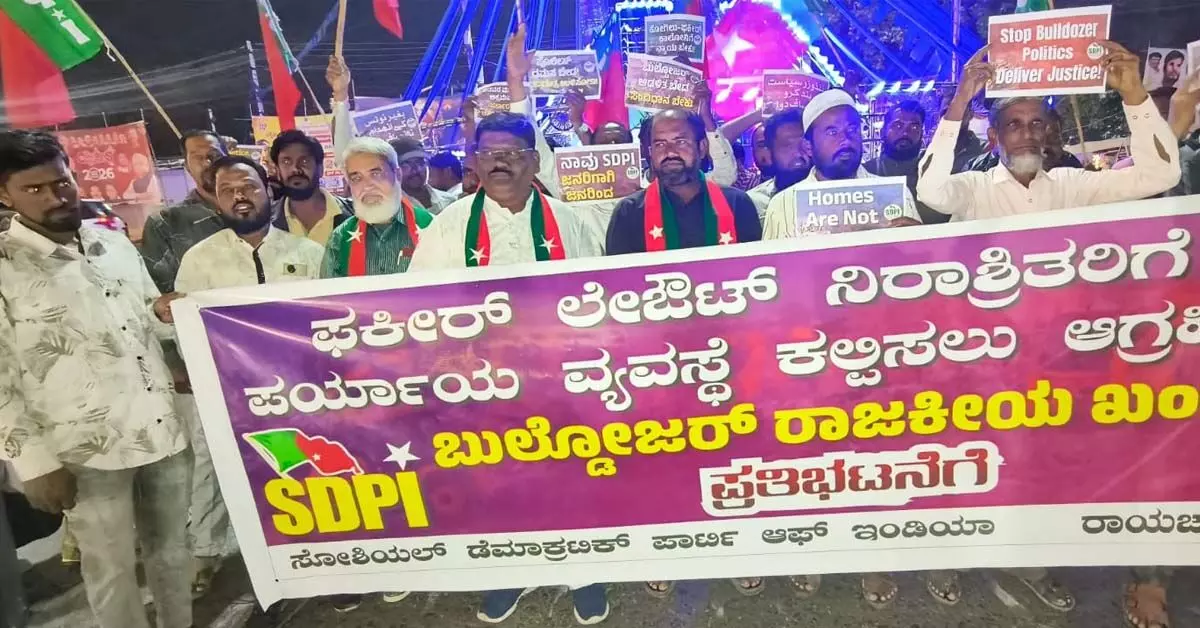 ರಾಯಚೂರು:ಬೆಂಗಳೂರು ಯಲಹಂಕ ವಿಧಾನಸಭಾ ಕ್ಷೇತ್ರದ ಕೋಗಿಲು ಲೇಔಟ್ನ ಫಕೀರ್ ಕಾಲೊನಿಯಲ್ಲಿ ನೂರಾರು ಮನೆಗಳನ್ನು ಧ್ವಂಸಗೊಳಿಸಿದ ಸರ್ಕಾರದ ಕ್ರಮವನ್ನು ಖಂಡಿಸಿ ಸೋಶಿಯಲ್ ಡೆಮಾಕ್ರೆಟಿಕ್ ಪಾರ್ಟಿ ಆಫ್ ಇಂಡಿಯಾ ವತಿಯಿಂದ ಪ್ರತ