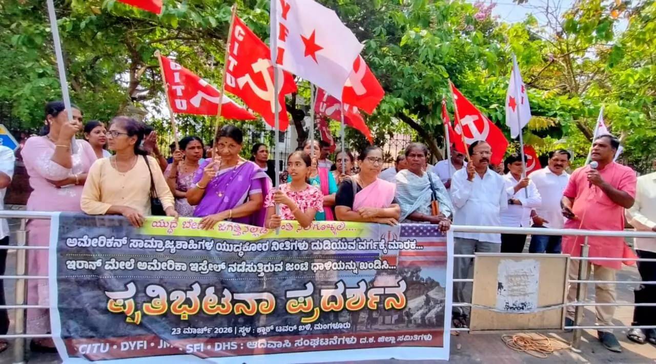 ಮಂಗಳೂರು: ಅಮೆರಿಕನ್ ಸಾಮ್ರಾಜ್ಯಶಾಹಿಗಳ ಯುದ್ಧಕೋರ ನೀತಿಗಳನ್ನು ಖಂಡಿಸಿ ಸಿಐಟಿಯು, ಡಿವೈಎಫ್ಐ, ಜೆಎಂಎಸ್, ಡಿಎಚ್ಎಸ್ , ಆದಿವಾಸಿ ಸಂಘಟನೆಗಳ ಜಂಟಿ ನೇತೃತ್ವದಲ್ಲಿ ಪ್ರತಿಭಟನೆ ನಡೆಯಿತು. ಅಮೆರಿಕನ್ ಸಾಮ್ರಾಜ್ಯಶಾಹಿಗಳ ಯು
