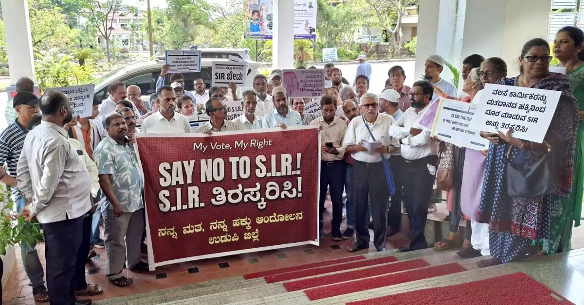 ಉಡುಪಿ, ಎ.15: ಮತದಾರರ ಪಟ್ಟಿಯ ವಿಶೇಷ ತೀವ್ರ ಪರಿಷ್ಕರಣೆ (ಎಸ್ಐಆರ್)ಯನ್ನು ವಿರೋಧಿಸಿ ‘ನಮ್ಮ ಮತ ನಮ್ಮ ಹಕ್ಕು’ ಕರ್ನಾಟಕದ ನಾಗರಿಕ ಸಂಘಟನೆಗಳ ಒಕ್ಕೂಟ ಉಡುಪಿ ಜಿಲ್ಲೆ ಇದರ ನೇತೃತ್ವದಲ್ಲಿ ಬುಧವಾರ ಉಡುಪಿ ಜಿಲ್ಲಾಧಿಕಾರಿ ಕಚೇರ