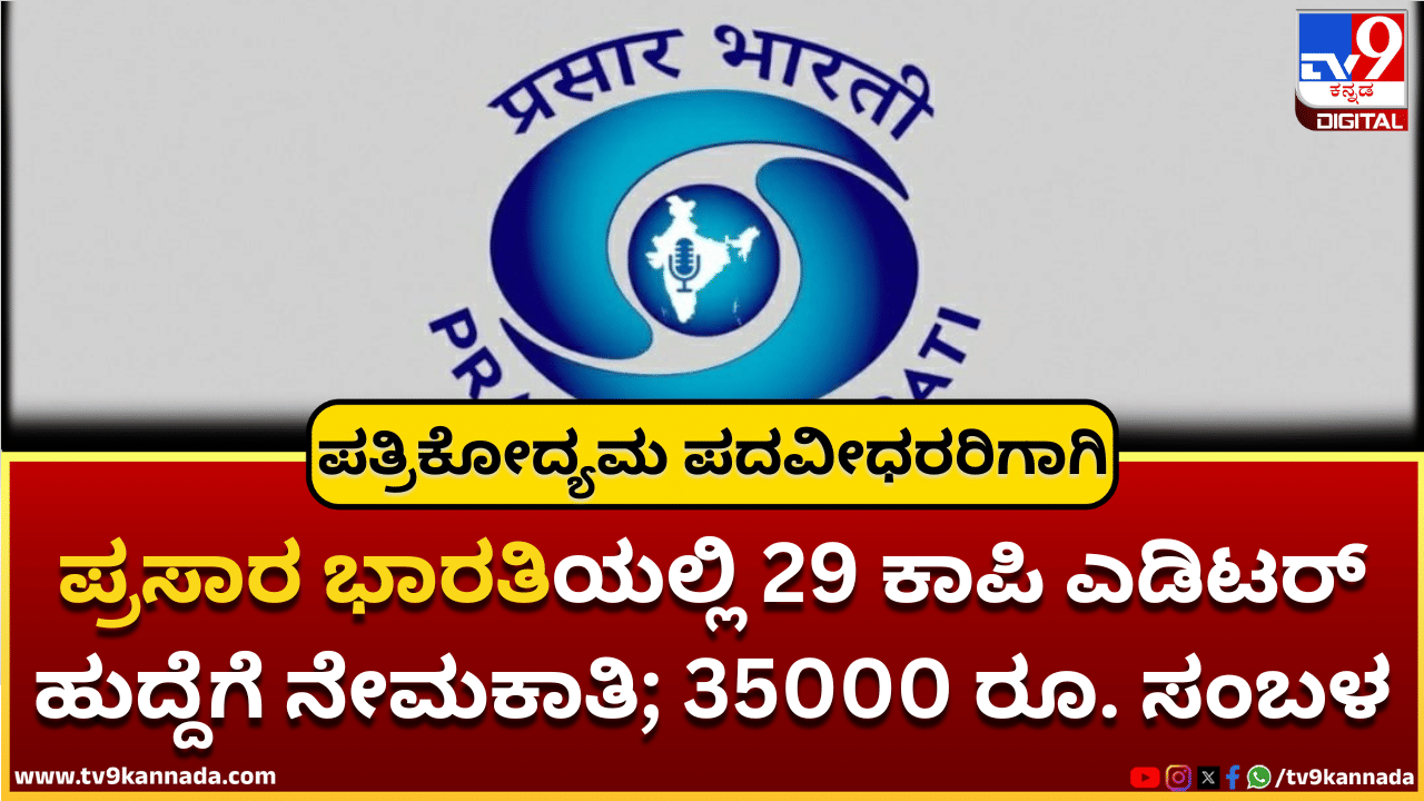 ಪ್ರಸಾರ ಭಾರತಿ 29 ಕಾಪಿ ಎಡಿಟರ್ ಹುದ್ದೆಗಳಿಗೆ ಅರ್ಜಿ ಆಹ್ವಾನಿಸಿದೆ. ದೂರದರ್ಶನ ಮತ್ತು ಆಲ್ ಇಂಡಿಯಾ ರೇಡಿಯೋದಲ್ಲಿ ಖಾಲಿ ಹುದ್ದೆಗಳಿವೆ. ಪತ್ರಿಕೋದ್ಯಮ/ಸಮೂಹ ಸಂವಹನ ಪದವಿ, 5 ವರ್ಷದ ಅನುಭವ ಮತ್ತು 35 ವರ್ಷ ವಯೋಮಿತಿ ನಿಗದಿಪಡಿಸ