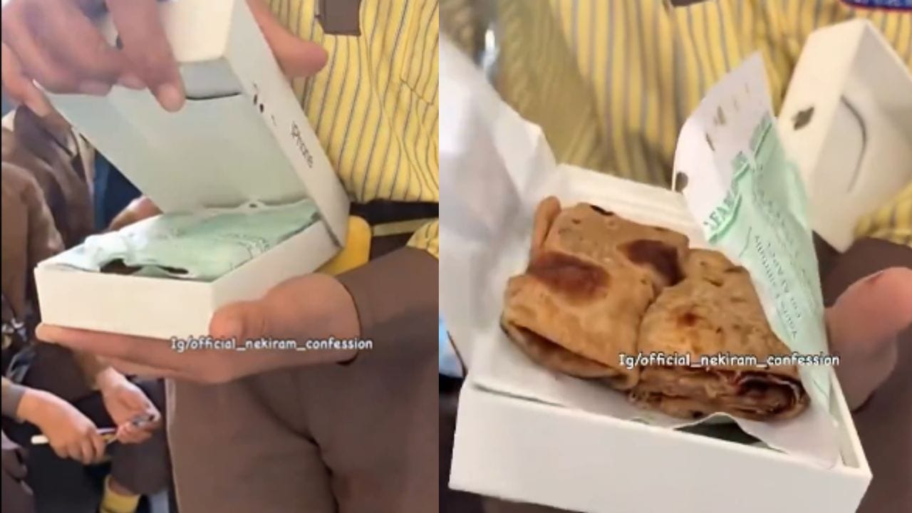 ಶಾಲೆಗೆ ವಿದ್ಯಾರ್ಥಿಯೊಬ್ಬ ಐಫೋನ್ ಬಾಕ್ಸ್ನಲ್ಲಿ ಪರಾಠಾ ತಂದ ವಿಡಿಯೋ ವೈರಲ್ ಆಗಿದೆ. ಶಿಕ್ಷಕರು ಪ್ರಶ್ನಿಸಿದಾಗ, ಬಾಲಕ ಗಂಭೀರವಾಗಿ ಉತ್ತರಿಸಿ ಎಲ್ಲರನ್ನೂ ನಗಿಸಿದ್ದಾನೆ. ಶಿಕ್ಷಕರು ಬಾಕ್ಸ್ ತೆರೆದಾಗ ಪರಾಠಾ ನೋಡಿ ಅಚ್ಚರ