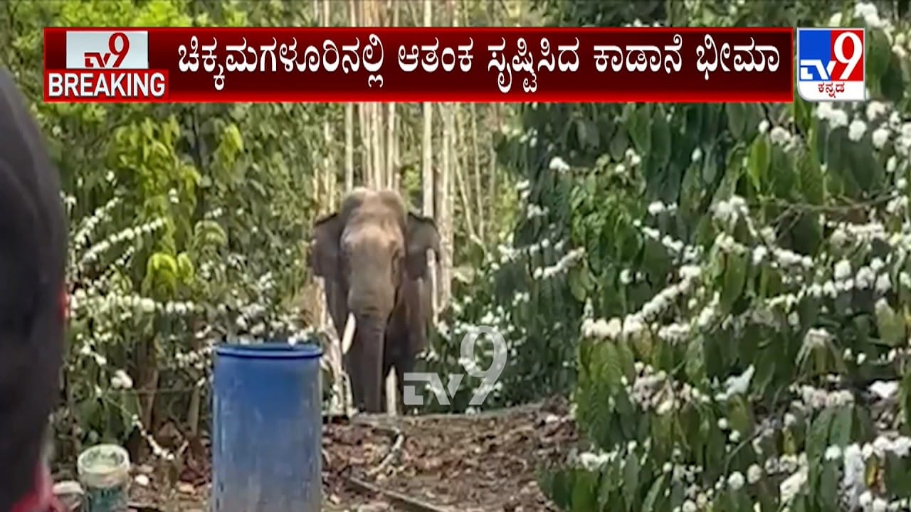 ಚಿಕ್ಕಮಗಳೂರಿನ ಗೋಣಿಬೀಡು ಸಮೀಪದ ಕಾಫಿ ತೋಟದಲ್ಲಿ ಕಾಡಾನೆ ಭೀಮ ಕಳೆದ ನಾಲ್ಕು ದಿನಗಳಿಂದ ಬೀಡುಬಿಟ್ಟಿದೆ. ಹಾಸನದ ಬೇಲೂರಿನಿಂದ ಬಂದ 30 ಕಾಡಾನೆಗಳ ಹಿಂಡಿನಿಂದ ಬೇರ್ಪಟ್ಟು ಭೀಮ ಜನವಸತಿ ಪ್ರದೇಶಕ್ಕೆ ನುಗ್ಗಿದೆ. ಅರಣ್ಯ ಇಲಾಖೆ