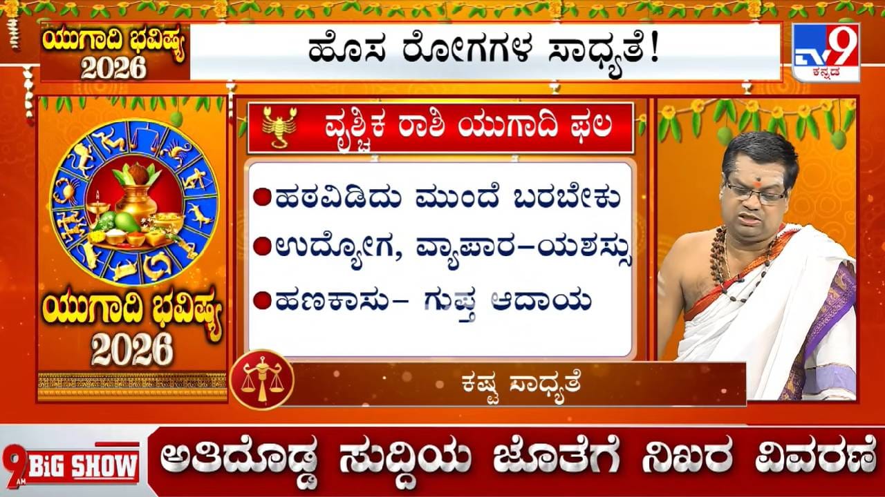 ವೃಶ್ಚಿಕ ರಾಶಿಯವರಿಗೆ ಯುಗಾದಿ 2026ರ ಭವಿಷ್ಯವು ಉದ್ಯೋಗ ಮತ್ತು ವ್ಯಾಪಾರದಲ್ಲಿ ದೃಢ ಸಂಕಲ್ಪದಿಂದ ಯಶಸ್ಸು ತರುತ್ತದೆ. ಗುಪ್ತ ಆದಾಯಕ್ಕೆ ಅವಕಾಶಗಳಿದ್ದು, ಕುಟುಂಬದ ಸಮಸ್ಯೆಗಳು ಬಗೆಹರಿಯಲಿವೆ. ಆರೋಗ್ಯದ ಕುರಿತು ಎಚ್ಚರ ಅಗತ್ಯ.