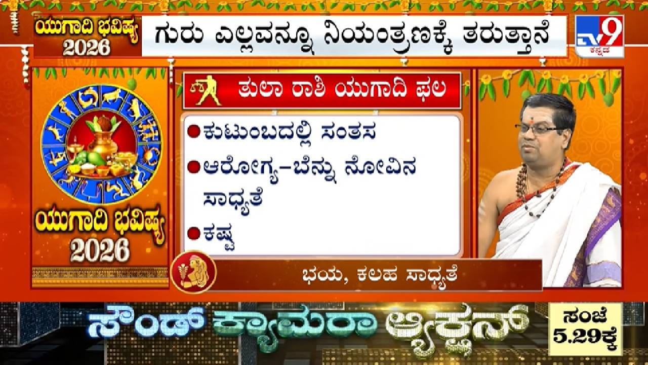 2026ರ ಯುಗಾದಿ ತುಲಾ ರಾಶಿಯವರಿಗೆ ಸಮತೋಲನದ ವರ್ಷವಾಗಲಿದೆ. ಉದ್ಯೋಗ, ವ್ಯಾಪಾರದಲ್ಲಿ ಉತ್ತಮ ಪಾಲುದಾರಿಕೆ, ಆದಾಯದಲ್ಲಿ ಸಮತೋಲನ, ಕುಟುಂಬದಲ್ಲಿ ಅನ್ಯೋನ್ಯತೆ ಹೆಚ್ಚಲಿದೆ. ಆರೋಗ್ಯದಲ್ಲಿ ಬೆನ್ನುನೋವು ಕುರಿತು ಎಚ್ಚರಿಕೆ ಅಗತ್ಯ.