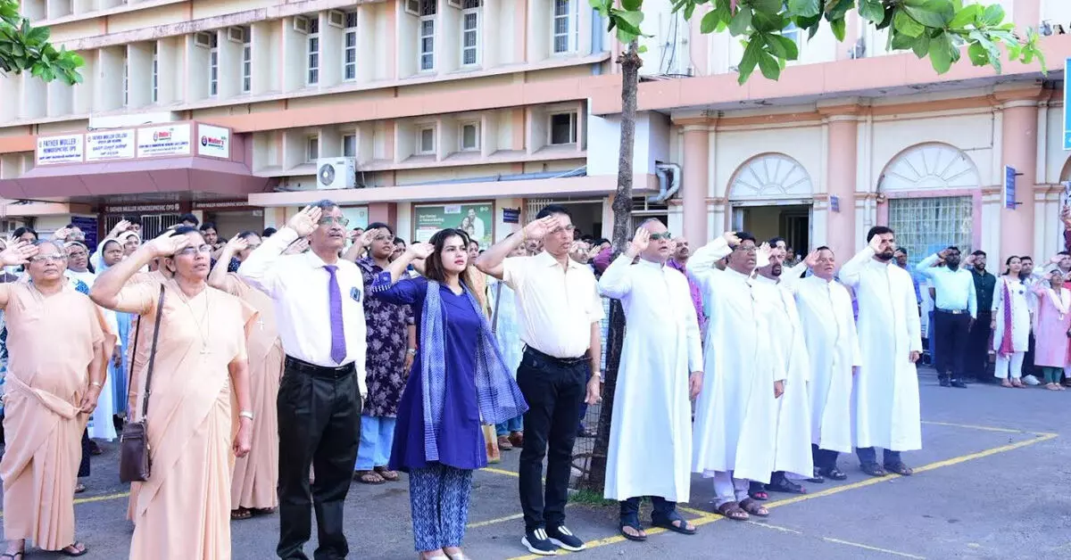 ಮಂಗಳೂರು, ಜ.26: ಫಾದರ್ ಮುಲ್ಲರ್ ಚಾರಿಟೇಬಲ್ ಸಂಸ್ಥೆಗಳ ವತಿಯಿಂದ ಭಾರತದ 77ನೇ ಗಣರಾಜ್ಯೋತ್ಸವವನ್ನು ಸೋಮವಾರ ಆಚರಿಸಲಾಯಿತು. ಸಂಸ್ಥೆಯ ಮುಂಭಾಗದ ಮೈದಾನದಲ್ಲಿ ಫಾದರ್ ಮುಲ್ಲರ್ ವೈದ್ಯಕೀಯ ಕಾಲೇಜು ಆಸ್ಪತ್ರೆಯ ಆಡಳಿತಾಧಿಕಾರಿ ರ