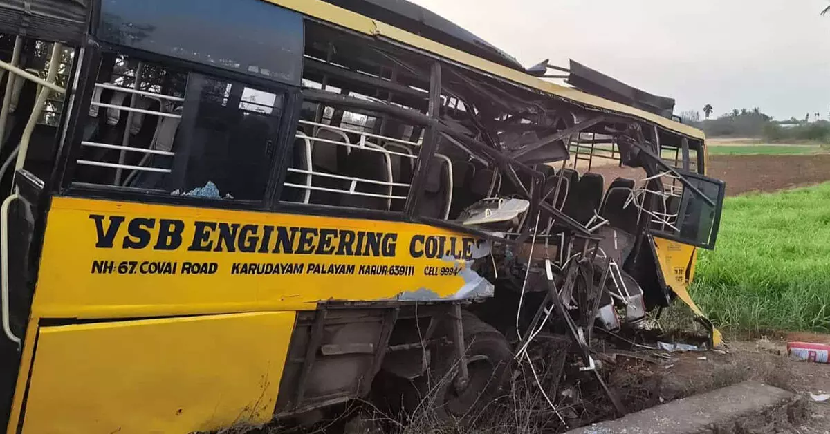 ಕರೂರು,ಮಾ.15: ಖಾಸಗಿ ಇಂಜಿನಿಯರಿಂಗ್ ಕಾಲೇಜಿಗೆ ಸೇರಿದ ಬಸ್ಗೆ ಸರಕು ಸಾಗಣೆ ರೈಲು ಢಿಕ್ಕಿ ಹೊಡೆದ ಪರಿಣಾಮ 20ಕ್ಕೂ ಅಧಿಕ ವಿದ್ಯಾರ್ಥಿಗಳು ಗಾಯಗೊಂಡಿರುವ ಘಟನೆ ಶನಿವಾರ ಇಲ್ಲಿ ನಡೆದಿದೆ ಎಂದು ಪೊಲೀಸರು ತಿಳಿಸಿದ್ದಾರೆ. ಬಸ್ ವೀರ