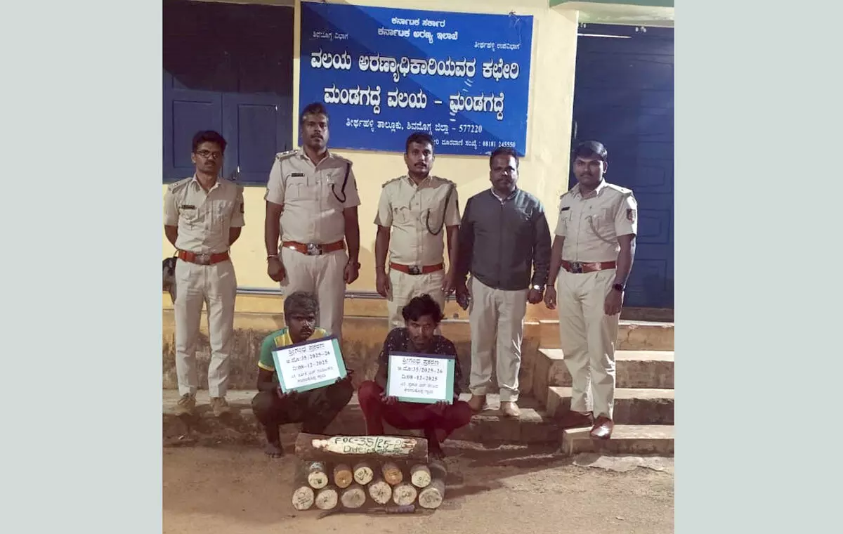 ಶಿವಮೊಗ್ಗ: ಅಕ್ರಮವಾಗಿ ಶ್ರೀಗಂಧ ಸಾಗಣೆ ಮಾಡುತ್ತಿದ್ದ ಆರೋಪದಲ್ಲಿ ಇಬ್ಬರನ್ನು ಮಂಡಗದ್ದೆ ವಲಯಾರಣ್ಯಧಿಕಾರಿ ವಿನಯಕುಮಾರ್ ನೇತೃತ್ವದ ಅರಣ್ಯ ಇಲಾಖೆ ಸಿಬ್ಬಂದಿ ಬಂಧಿಸಿದೆ. ಕಣಗಲಕೊಪ್ಪ ಗ್ರಾಮದ ಸತೀಶ್ (32), ಪ್ರಕಾಶ್ (32) ಬಂಧಿತ