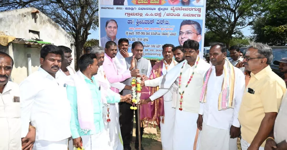 ಕೂಡ್ಲಿಗಿ : ಉಜ್ಜಿನಿ ಗ್ರಾಮ ಪಂಚಾಯತ್ ವ್ಯಾಪ್ತಿಯ ಭೈರದೇವರಗುಡ್ಡ ಗ್ರಾಮದಲ್ಲಿ ಶಾಸಕ ಡಾ. ಎನ್.ಟಿ. ಶ್ರೀನಿವಾಸ್ ಅವರು ಮಂಗಳವಾರ (ಜ. 20) ವಿವಿಧ ಅಭಿವೃದ್ಧಿ ಕಾಮಗಾರಿಗಳಿಗೆ ಚಾಲನೆ ನೀಡಿದರು. ಗ್ರಾಮದ ಸರ್ಕಾರಿ ಕಿರಿಯ ಪ್ರಾಥಮಿ