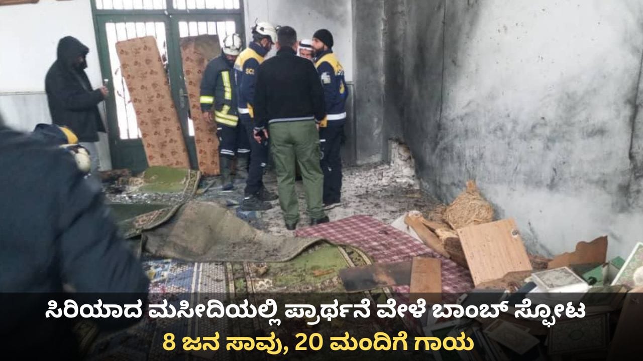 ಇಂದು ಪ್ರಾರ್ಥನೆಯ ವೇಳೆ ಸಿರಿಯಾದ ಹೋಮ್ಸ್ ಪಟ್ಟಣದ ಮಸೀದಿಯಲ್ಲಿ ಸಂಭವಿಸಿದ ಭಾರಿ ಸ್ಫೋಟದಲ್ಲಿ 8 ಜನರು ಸಾವನ್ನಪ್ಪಿದ್ದಾರೆ, 20ಕ್ಕೂ ಹೆಚ್ಚು ಜನರು ಗಾಯಗೊಂಡಿದ್ದಾರೆ. ಮಧ್ಯ ಸಿರಿಯಾದ ಹೋಮ್ಸ್ ನಗರದಲ್ಲಿರುವ ಇಮಾಮ್ ಅಲಿ ಬಿನ್