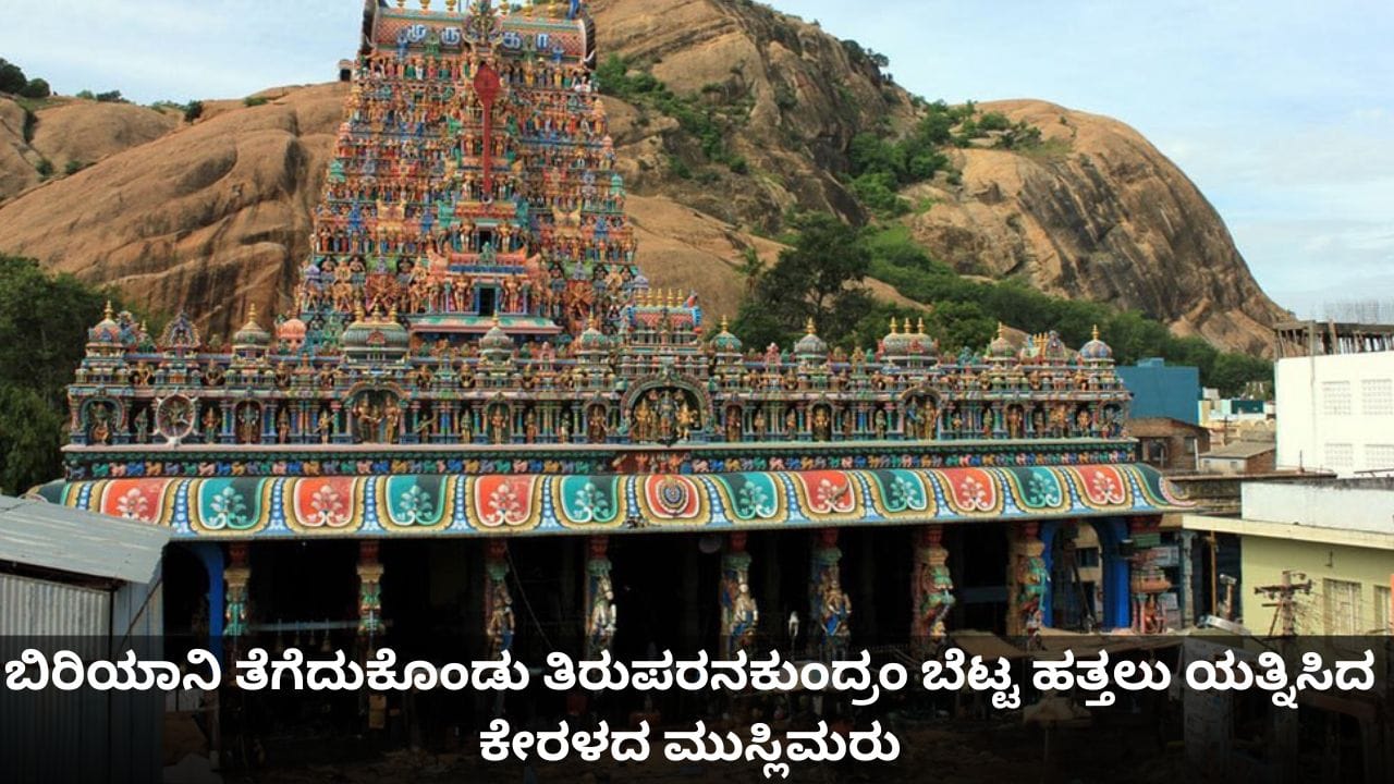 ಕೇರಳದ ಮುಸ್ಲಿಮರು ತಿರುಪರನಕುಂದ್ರಂ ಸುಬ್ರಹ್ಮಣ್ಯಂ ದೇವಾಲಯದ ಬೆಟ್ಟವನ್ನು ಬಿರಿಯಾನಿಯೊಂದಿಗೆ ಹತ್ತಲು ಯತ್ನಿಸಿದ ಘಟನೆ ಕೋಲಾಹಲಕ್ಕೆ ಕಾರಣವಾಗಿದೆ. ಅವರು ಬೆಟ್ಟದ ಮೇಲಿನ ದರ್ಗಾಕ್ಕೆ ಬಿರಿಯಾನಿ ಸೇರಿದಂತೆ ಮಾಂಸಾಹಾರವನ