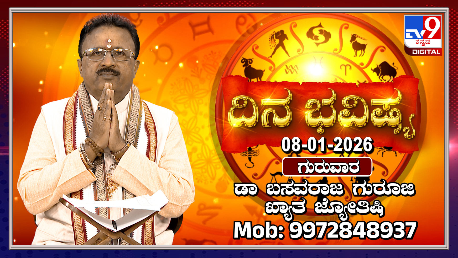 ಟಿವಿ9 ಡಿಜಿಟಲ್ನ ದಿನ ಭವಿಷ್ಯ ಕಾರ್ಯಕ್ರಮದಲ್ಲಿ ಖ್ಯಾತ ಜ್ಯೋತಿಷಿ ಡಾ. ಬಸವರಾಜ ಗುರೂಜಿ ಅವರು 2026ರ ಜನವರಿ 8ರ ದ್ವಾದಶ ರಾಶಿಗಳ ಸಂಪೂರ್ಣ ಫಲಾಫಲಗಳನ್ನು ವಿವರಿಸಿದ್ದಾರೆ. ಈ ದಿನದ ಪಂಚಾಂಗ, ಶುಭ-ರಾಹುಕಾಲ, ಗ್ರಹಗಳ ಸಂಚಾರ ಹಾಗೂ ಪ