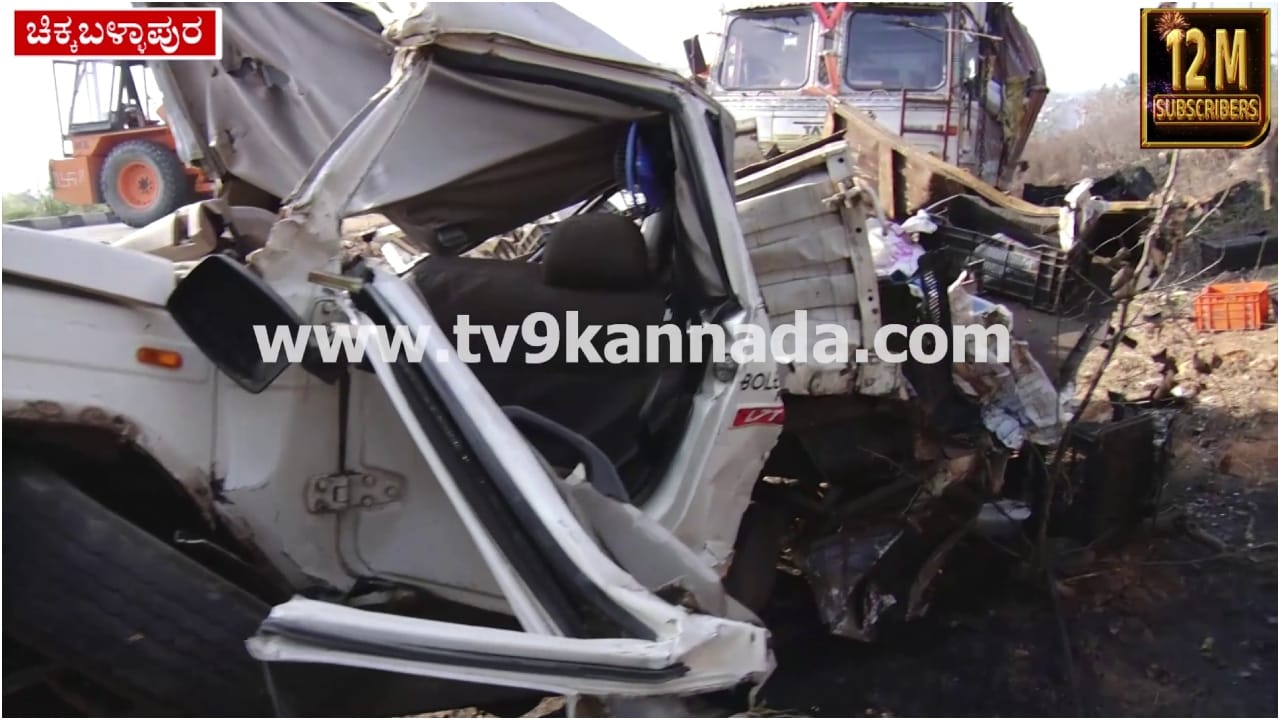 ಚಿಕ್ಕಬಳ್ಳಾಪುರ ಬಳಿ ರಾಷ್ಟ್ರೀಯ ಹೆದ್ದಾರಿ 44 ರಲ್ಲಿ ಬೊಲೆರೋಗೆ ಕಂಟೇನರ್ ಲಾರಿ ಗುದ್ದಿ ಅದರ ಮೇಲೆ ಉರುಳಿಬಿದ್ದ ಪರಿಣಾಮ ಬೊಲೆರೋ ಚಾಲಕ ಸ್ಥಳದಲ್ಲೇ ಸಾವನ್ನಪ್ಪಿದ್ದಾರೆ. ಅಪಘಾತದ ತೀವ್ರತೆಗೆ ಬೊಲೆರೋ ಜೀಪ್ ಸಂಪೂರ್ಣ ನುಜ್ಜ