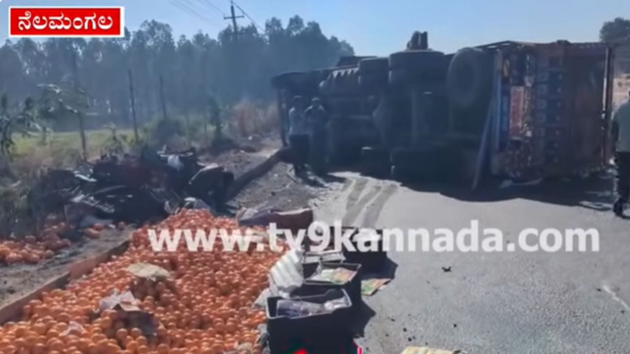 ನೆಲಮಂಗಲ ತಾಲೂಕಿನ ಕೆಂಗಲ್ ಗ್ರಾಮದ ಬಳಿ ಚಾಲಕನ ನಿಯಂತ್ರಣ ತಪ್ಪಿ ಆರೆಂಜ್ ತುಂಬಿದ ಲಾರಿಯೊಂದು ಪಲ್ಟಿಯಾಗಿದೆ. ಮುಂಬೈನಿಂದ ಬೆಂಗಳೂರಿಗೆ ಬರುತ್ತಿದ್ದ ಈ ಲಾರಿಯ ಅಪಘಾತದಿಂದಾಗಿ ಲಕ್ಷಾಂತರ ರೂಪಾಯಿ ಮೌಲ್ಯದ ಆರೆಂಜ್ ಹಣ್ಣುಗಳ